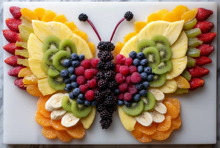 Die Lösung kam unerwartet beim Durchscrollen durch Pinterest an einem Sonntagabend: ein riesiger bunter Obstschmetterling. Nicht als langweilige „gesunde Beilage“, sondern als DER absolute Star auf dem Partytisch. Als Hauptattraktion. Als das Ding, bei dem alle Kinder mit großen Augen stehen bleiben und sagen: „Wow, ist das cool!“